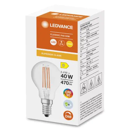 Beschrijving Ledvance Superior Classic LED E14 Kogel Filament Helder 3.4W 470lm - 927 Zeer Warm Wit | Dimbaar - Beste Kleurweergave