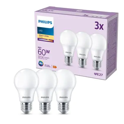 Beschrijving Voordeelpak 3x Philips Lamp LED E27 Peer Mat 8W 806lm - 827 Zeer Warm Wit